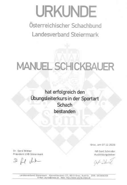 Manuel Schickbauer hat erfolgreich den Übungsleiterkurs (C-Trainerausbildung) in der Sportart Schach bestanden. Wir gratulieren Manuel herzlich.